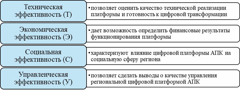 Эффективность функционирования региональной цифровой платформы АПК предлагается рассматривать как интегральную характеристику, отражающую степень достижения поставленных целей при оптимальном использовании ресурсов.