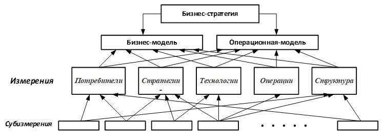 Цифровая зрелость компании по идеологии, заложенной в модель, определяется бизнес-стратегией, которая определят бизнес-модель и операционную модель. Именно эти составляющие являются ключевыми и оцениваются по пяти измерениям: потребители – стратегии – технологии – операции – структура [1, 3]. Они, в свою очередь, состоят из группы показателей (Рис.1). Модель представляется достаточно сложной для группировки данных и расчетов.