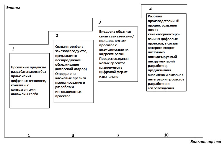Для каждого направления выделяются этапы цифровой зрелости с указанием балльной оценки каждого этапа. Оценка проводится экспертным путем. При этом информация, определяющая принадлежность к тому или иному этапу и влияющая на величину балла, подтверждается такими документами, как лицензии на выполнение тех или иных видов проектных работ, договора с заказчиками и подрядчиками с определением формата передачи проектно-сметной документации (цифровой/традиционный), лицензиями на те или иные пакеты прикладных программ, пояснительные записки к ПСД, проекты организации строительства, сметная документация, планы-графики выполнении проектных работ по различным разделам, отчеты о выполнении отдельных видов проектных работ, акты устранения замечаний по результатам экспертиз проектов и др. Необходимость анализа такой проектной документации определяется требованиями ее использования в соответствии с национальными стандартами (например, ГОСТ Р 21.101-2020 «Национальный стандарт Российской Федерации Система проектной документации для строительства. Основные требования к проектной и рабочей документации»). При этом изучается информация о форматах передачи документации и задействованных режимах передачи: электронный сетевой, традиционный, смешанный [9, 10, 11].