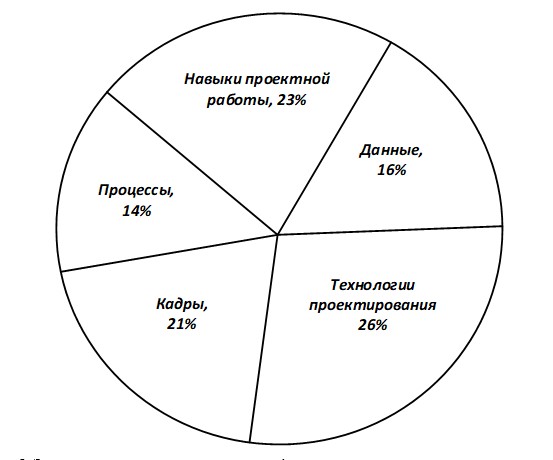 Изначально была дана экспертиза значимости оценок направлений цифровой зрелости для проектных компаний (Рис. 5). Наиболее значимыми названы направления «Технологии проектирования» (26 %) и «Навыки проектной работы» (23 %).