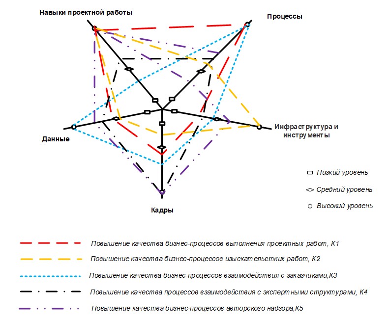 Далее оценка велась по каждому из пяти представленных выше направлений оценки цифровой зрелости (навыки проектной работы, процессы, данные, инфраструктура и инструменты, кадры) по критериям «Повышение качества бизнес-процессов выполнения проектных работ, К1», «Повышение качества бизнес-процессов выполнения изыскательских работ, К2», «Повышение качества бизнес-процессов взаимодействия с заказчиками, К3», «Повышение качества процессов взаимодействия с экспертными структурами, К4» и «Повышение качества бизнес-процессов авторского надзора, К5».