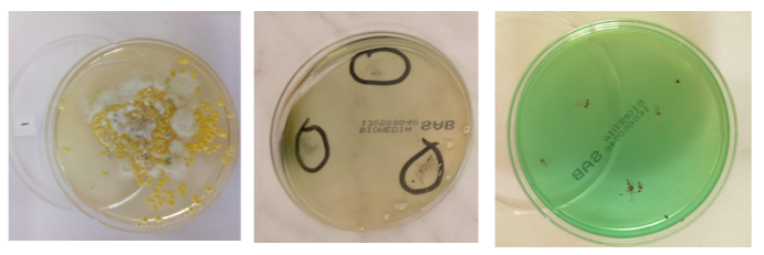 Для получения культур плесневых грибов р. Penicillium и р. Aspergillus нами использовалась готовая питательная среда Сабуро органического происхождения. Посев воздушной микрофлоры на питательную среду проводился в соответствии с общепринятой методикой культивирования микроорганизмов. На поверхности питательной среды на 3-и сутки появились видимые невооруженным глазом колонии плесневых грибов, идентифицированные как представители р. Penicillium и р. Aspergillus согласно определителю Курсанов А. И.1 (Рис. 3).