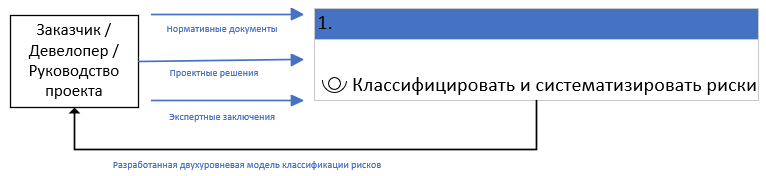 Контекстная диаграмма демонстрирует общий замысел системы — от входных данных (нормативная и проектная документация, исходно-разрешительные материалы) к целевому результату, которым является разработанная двухуровневая модель классификации и систематизации рисков.