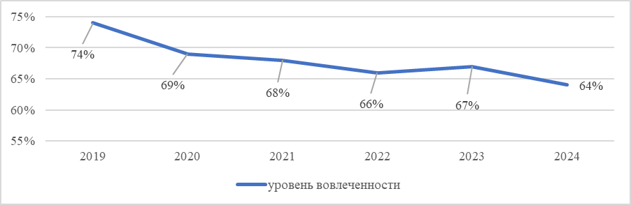 В 2020 году российские организации столкнулись с проблемой управления персоналом в условиях пандемии коронавируса. В связи с этим было произведено сокращение персонала, которое повлияло на уровень вовлеченности сотрудников. По данным отчета компании «ЭКОПСИ», уровень вовлеченности персонала в 2020 году снизился на 10% в сравнении с 2019 годом. На рисунке 1 представлена динамика изменения уровня вовлеченности работников за последние 6 лет [4].