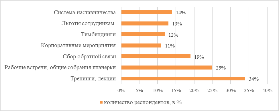 Как следует из рисунка 3, обучение в формате лекций и тренингов hr-менеджеры выделяют в качестве наиболее эффективного способа повышения вовлеченности персонала, поскольку лекции предоставляют возможность экспертам делиться своим опытом, а тренинги позволяют применять теоретические знания на практике, что значительно улучшает усвоение материала. Более того, лекции и тренинги могут быть адаптированы под различные уровни подготовки работников, что делает их доступными для широкой аудитории.