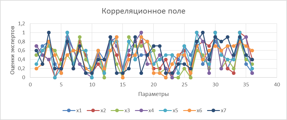 Рис. 3. Корреляционное поле параметров, влияющих на выполнение контрольных процедур неразрушающим методом