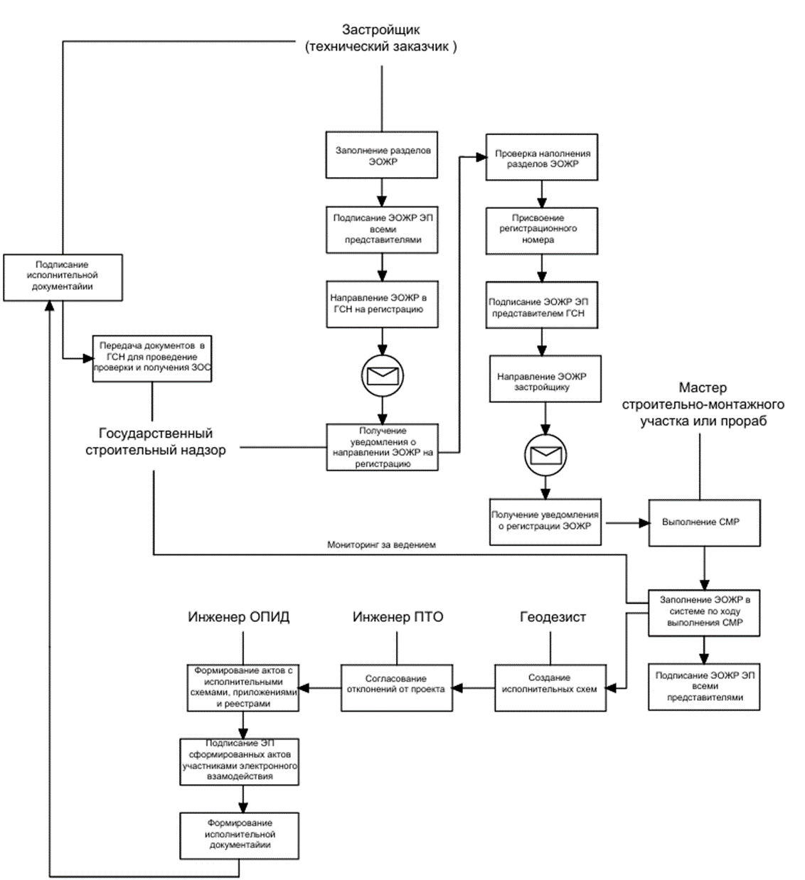 Вышеизложенный порядок отражает процесс взаимодействия между различными участниками инвестиционно-строительного проекта, начиная с заполнения и регистрации ЭОЖР, выполнения СМР или РСР и заканчивая формированием и передачей исполнительной документации в ГСН. Каждый этап порядка требует четкого соблюдения процедур и подписания документов по средствам электронной подписи, что обеспечивает прозрачность и контроль за процессом строительства (реконструкции, капитального ремонта).