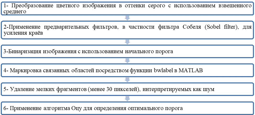 Однако основные ограничения алгоритма проявляются в реальных эксплуатационных условиях, особенно при нестабильном освещении. В условиях неоднородного освещения типичных для строительных площадок точность алгоритма значительно снижается. Так, в одном из исследований было показано, что при анализе взлётно-посадочных полос с переменным освещением эффективность алгоритма падала до 40%, а уровень ложноположительных срабатываний достигал 60% [1]. Как показано в исследовании [8], при применении алгоритма в идеальных лабораторных условиях на бетонных образцах размером 150×150×150 мм при контролируемом освещении достигается точность до 95%. Однако предложенная Талабом (Talab) методология выходит далеко за рамки базового алгоритма и включает комплексную последовательность обработки, представленную представленную на рисунке (1):