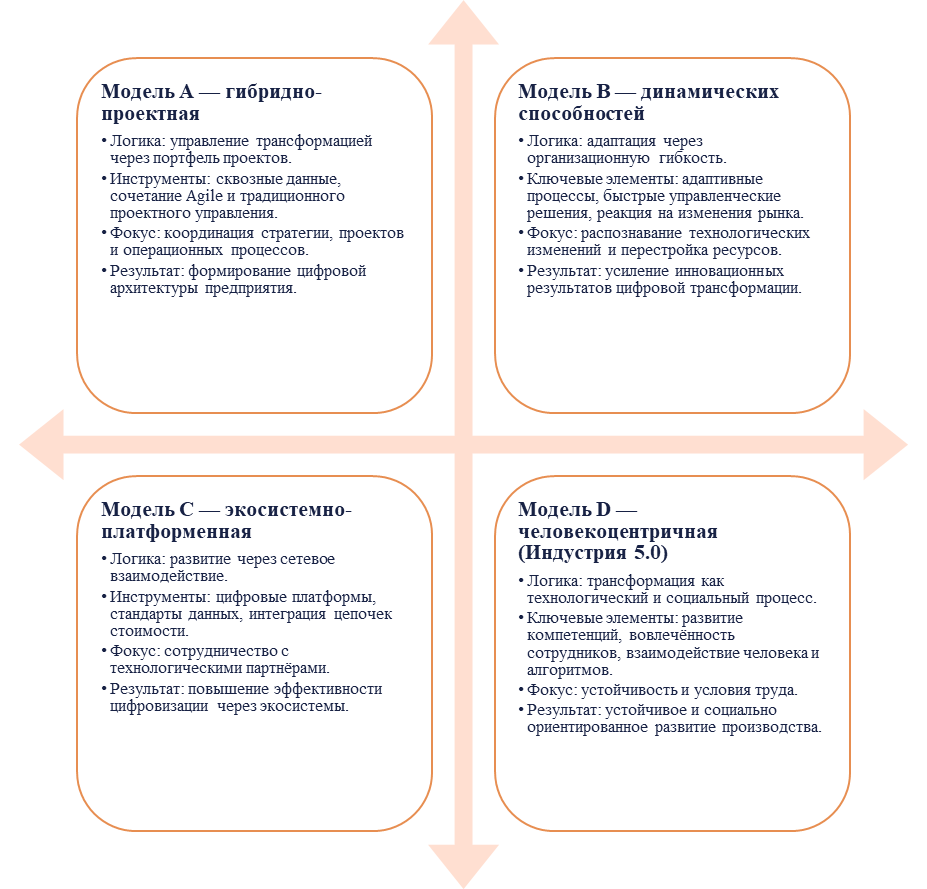 В рамках работы выделены четыре модели управленческой адаптации: гибридно-проектная, модель динамических способностей, экосистемно-платформенная и человекоцентричная («Индустрия 5.0»).