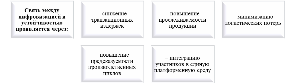 Тем самым цифровизация ЦПЦС выступает структурным фактором устойчивости, обеспечивая переход от отраслевой модернизации к платформенно-интегрированным агроэкосистемам, где устойчивость определяется способностью цепочки адаптироваться к внешним шокам за счёт координации и перераспределения ресурсов.