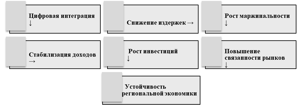Таким образом, логика выявленной зависимости может быть представлена как последовательность: технологический потенциал → институциональная среда → интеграция участников → снижение издержек → устойчивость региональной экономики.