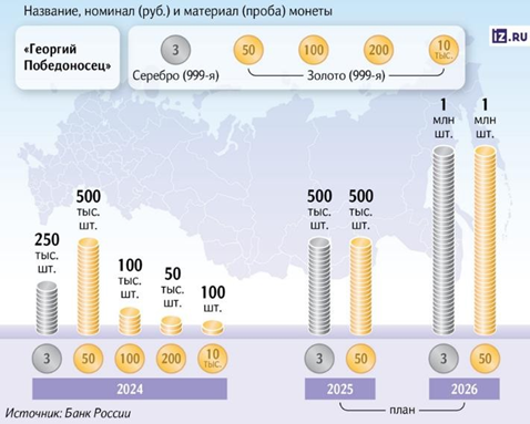 Банк России в 2026 году планирует увеличить выпуск инвестиционных монет. Совокупный тираж составит до 2 млн штук. Речь идёт о монете «Георгий Победоносец»: эмитировать собираются до 1 млн серебряных и до 1 млн золотых штук (Рис. 2).