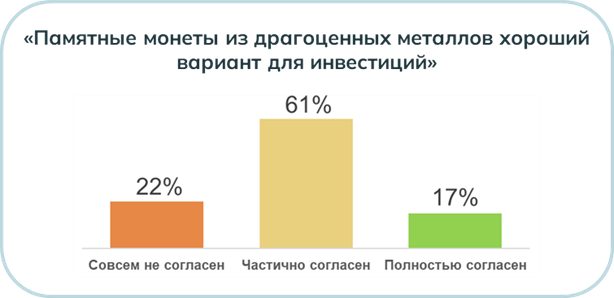 На Рисунке 4 представлены результаты оценки утверждения «Памятные монеты из драгоценных металлов хороший вариант для инвестиций» участниками онлайн-опроса. 78% опрошенных согласны или частично согласны, что памятные монеты являются хорошим вариантом инвестирования.