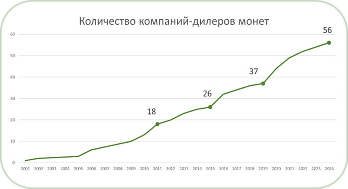 На монетном рынке прослеживается увеличение количества дилеров монет после пандемии в 2019 году.