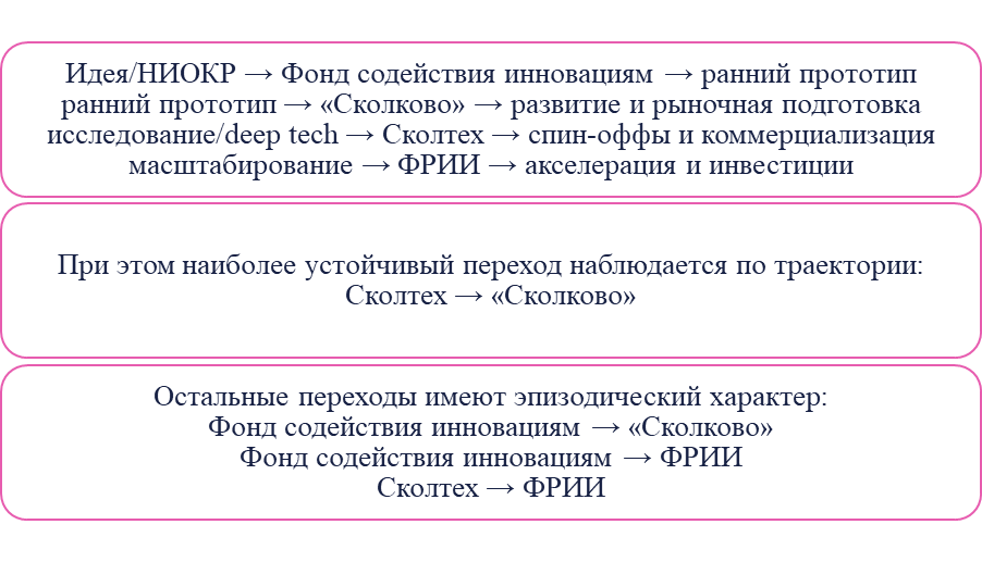 Проведенный анализ показывает, что российская инфраструктура поддержки коммерциализации технологий в формальном отношении выглядит институционально насыщенной, однако эта насыщенность не переходит автоматически в согласованную систему. С точки зрения логики национальной инновационной системы исследуемые институты действительно закрывают основные стадии инновационного цикла. Фонд содействия инновациям работает с ранними проектами и малыми технологическими компаниями, «Сколково» предоставляет экосистему развития и преференциальный режим, Сколтех совмещает исследовательскую и предпринимательскую функции, а ФРИИ ориентирован на акселерацию и инвестиции в рыночные цифровые проекты. В этом смысле российская система не испытывает дефицита организационных форм. Однако при переходе от уровня наличия институтов к уровню их взаимодействия обнаруживается фрагментация: наиболее выраженная связка прослеживается между Сколтехом и «Сколково», тогда как остальные переходы носят гораздо менее институционализированный характер. Характерно, что в годовом отчете Сколтеха за 2022 год прямо указывается, что сотрудники, исследователи, студенты и выпускники института создали 148 стартапов, из которых 85 получили статус резидентов «Сколково», что подтверждает наличие сильной внутренней связки именно в этой паре институтов.