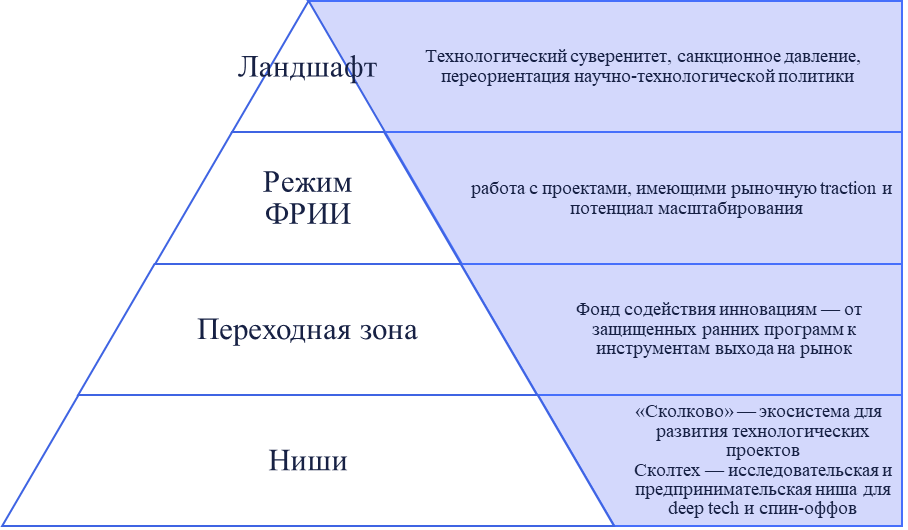 Рассмотрение через многоуровневую перспективу показывает, что исследуемые институты распределены по уровням неравномерно. «Сколково» и Сколтех в значительной степени функционируют как нишевые структуры, создающие защищенное пространство для экспериментов, исследовательских разработок и ранней коммерциализации. Фонд содействия инновациям занимает промежуточное положение, поскольку его ранние программы также защищают проект от рыночного давления, однако более поздние треки ориентируют компании на движение к рынку. ФРИИ ближе к уровню режима, так как работает с проектами, уже демонстрирующими рыночный спрос и готовность к масштабированию. Такое распределение институтов по уровням особенно важно, поскольку оно показывает: проблема заключается не только в различии организационных функций, но и в отсутствии устойчивых механизмов перехода между нишей, промежуточной зоной и режимом [13]. Иначе говоря, даже если на каждом уровне существуют собственные инструменты поддержки, сама траектория движения проекта между уровнями остается недостаточно институционализированной [3].