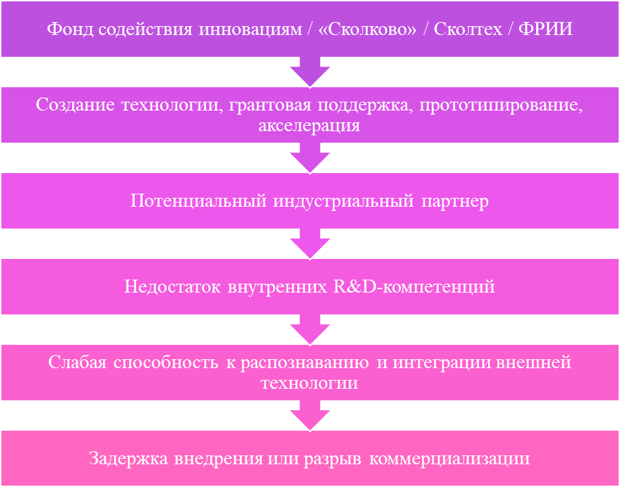 Из этого следует, что российская система лучше работает как механизм генерации предложения, чем как механизм институционализации спроса [5]. В прикладном смысле это означает, что значительная часть проектов развивается в ответ на требования грантодателя, акселератора или института поддержки, а не в ответ на четко артикулированный технологический запрос со стороны индустрии [8]. Следовательно, даже успешные проекты сталкиваются с проблемой внедрения, поскольку их траектория изначально выстраивалась без достаточно плотного участия конечного пользователя.