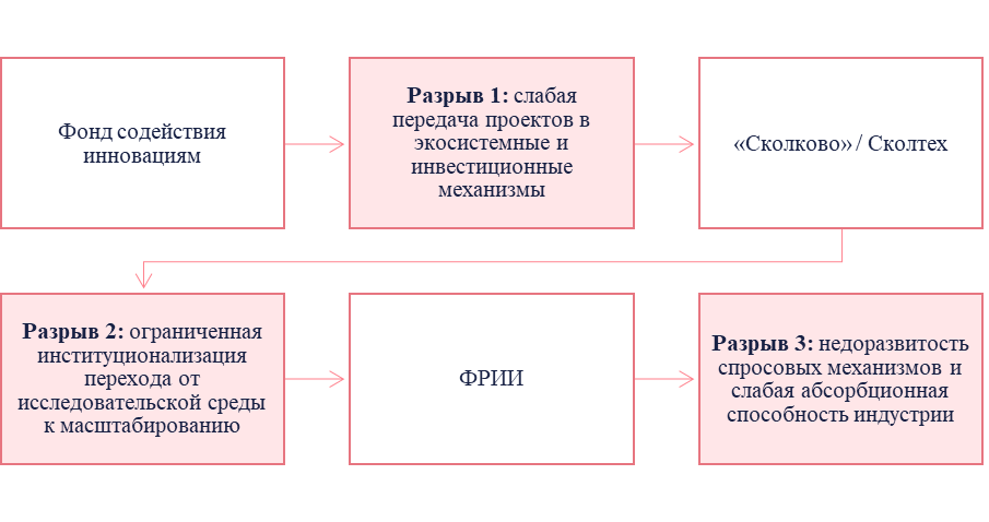 Следовательно, российская система коммерциализации сегодня представляет собой не целостную инновационную траекторию, а скорее совокупность сильных, но частично автономных институтов, между которыми образуются функциональные разрывы.
