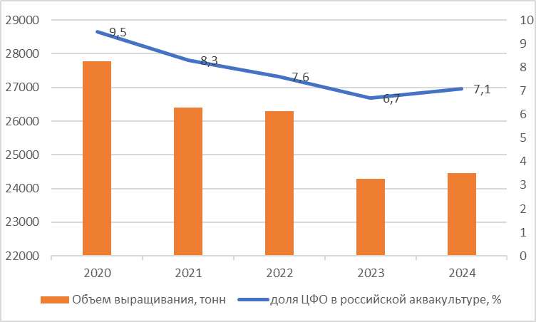 Рис. 1. Динамика выращивания аквакультуры в Центральном федеральном округе и её доля в российской аквакультуре (2020-2024 гг.), тонн