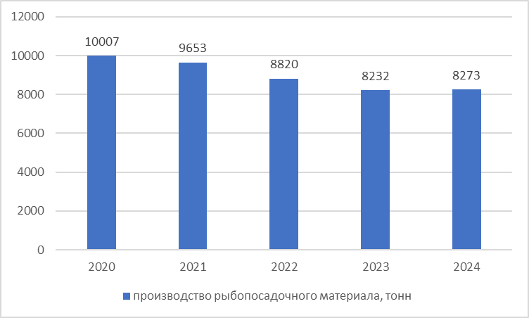 Рис. 2. Динамика производства (выращивания) рыбопосадочного материала в Центральном федеральном округе (2020-2024 гг.), тонн