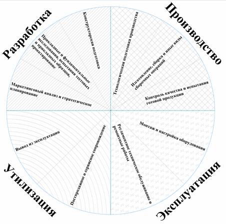 Длина дуги каждого сектора – это время, за которое длится каждый из этапов. Вся окружность – это время всего ЖЦ серии изделий «N», производимых научно-производственной организацией. В данном случае условно разделено на равные части, хотя в реальности соотношения как между стадиями из нескольких этапов, так и самими этапами внутри стадий различается, зачастую кратно.