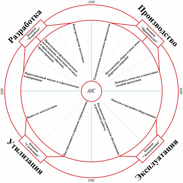 Автором предлагается применить концепцию КФК с точки зрения ЖЦ производимой продукции НПП, где участниками команд будут рассматриваться не как специалисты из отделов, а как участники стадий и этапов. Если же АИС – это информационные системы поддержки ЖЦ, то КФК ЖЦ будут являться организационным средством. Использование вместе обоих инструментов и будет являться комплексным подходом для организации процесса ЖЦ изделий НПП. КФК ЖЦ производимой продукции НПП будет являться внешним контуром взаимосвязанности данного процесса.