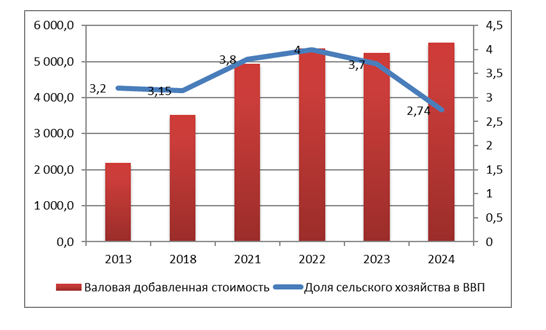 Сельское хозяйство является одной из важнейших отраслей экономики, обеспечивая продовольственную безопасность и экспортный потенциал страны. Статистически доля сельского хозяйства в валовом внутреннем продукте (далее – ВВП) составляет в среднем 5,4% [3]. Однако факторы природно-климатического, финансового и политического характера оказывают серьезное влияние на динамику показателя (рисунок 1).