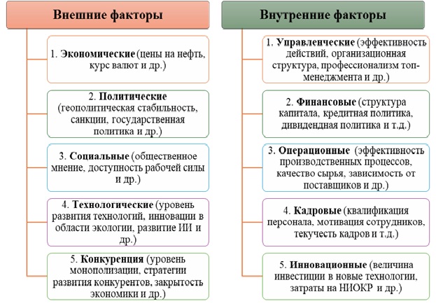 Наконец, одной из наиболее часто встречающихся классификаций факторов является их структуризация на основании источника происхождения. Внутренние факторы в полной мере зависят от качества корпоративного управления и эффективности организации внутренних процессов НПЗ, а вот внешние, напротив, находятся, главным образом. вне компетенции руководства конкретного предприятия, а зачастую оказывают значительное влияние на экономику в целом.