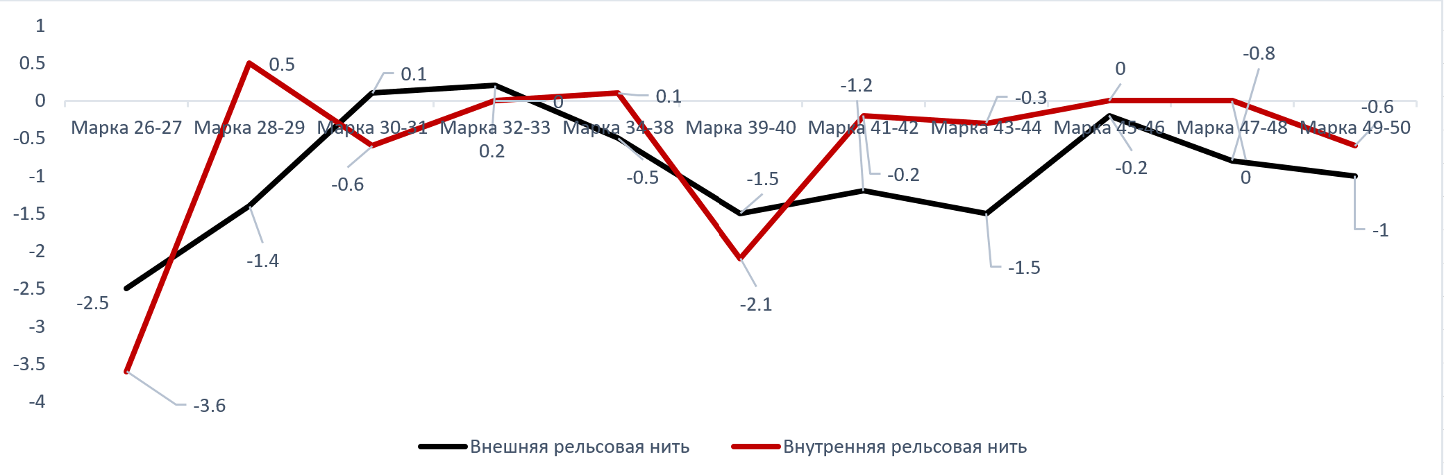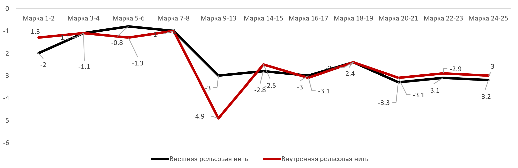 - на контрольном участке – 1,197 мм / млн. тонн брутто пропущенного тоннажа.