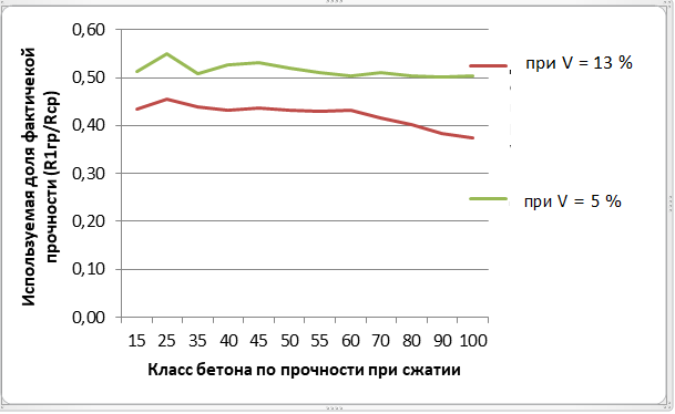 Можно выделить несколько важных причин. Первая находит отражение при проектировании и в процессе строительства, например, закладываются значительные коэффициенты запаса Кзап бетонов, для гарантии безотказности материала в конструкции1. Поэтому используется лишь небольшая доля прочности бетона. Например, для бетона класса В100 требуемый показатель средней прочности по результатам испытания ($$\bar{R}$$) должен составлять 128 МПа (при коэффициенте вариации ν=0,13), а минимальное единичное значение прочности (Rmin) должно быть выше класса (В) и составляет соответственно 100 МПа. При этом, прочность по первой группе предельных состояний составит Rb составляет 47,5 МПа [4]. Коэффициент запаса составит Кзап=2,7 (128׃47,5), в абсолютных величинах при прочности по первой группе предельных состоянии Rb=47,5 МПа запас составит 81 МПа, что на 172 % больше расчётной величины. Причем, чем выше класс бетона, тем меньше эффективность использования прочности бетонов. На Рис. 1. представлена зависимость доли использования расчетной прочности от фактической при различных коэффициентах вариации (ν) по российским нормативам.