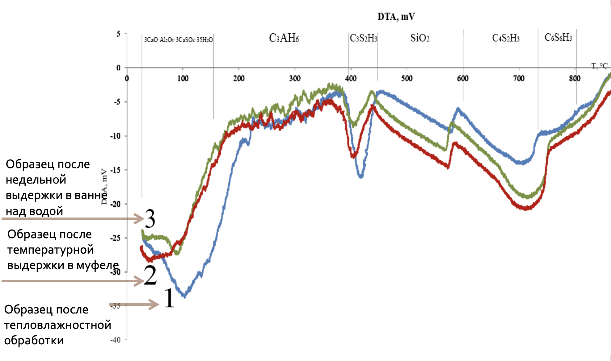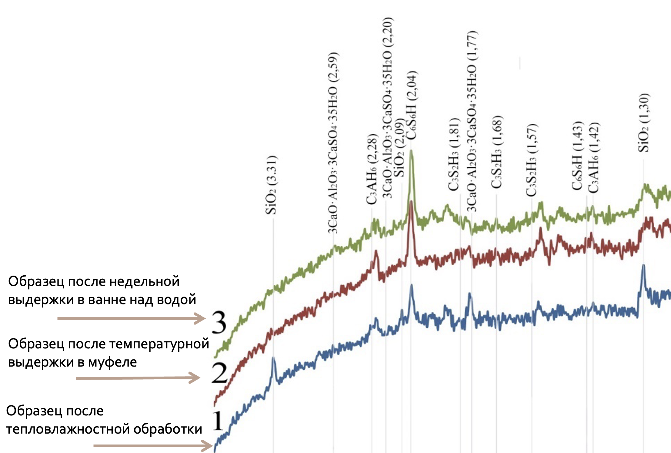 Проведённые физико-химические исследования показали отсутствие в образцах фазы портландита (Ca(OH)₂). Это позволяет утверждать, что он полностью прореагировал с компонентами комплексной тонкомолотой добавки и керамического сырья, перейдя в термостойкие фазы.