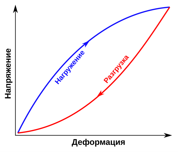 Из работ Сорокина Е.С. известно, что сообщенная материалу при нагрузке работа деформации возвращается при разгрузке не полностью. Часть механической работы, затраченная на неупругие деформации и поглощаемая материалом необратимо, измеряется петлей гистерезиса (Рис. 1) [11].