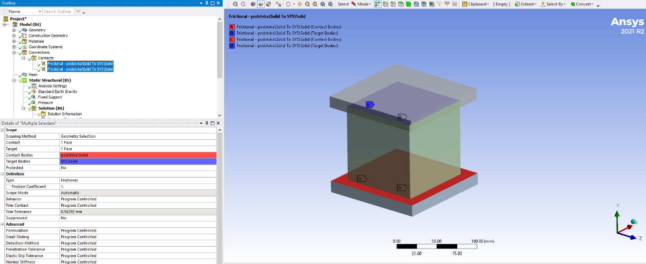 Граничные условия и нагружение модели задавались в полном соответствии «реальному» эксперименту. Для моделирования испытания на прессе, были смоделированы две металлический пластины из конструкционной стали (Рис. 2).