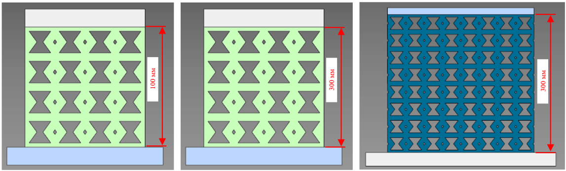 Для ауксетической структуры на основе возвратно-вогнутых ячеек, моделируемой в кубах размерами 100×100×100 мм, 200×200×200 мм и 300×300×300 мм (Рис. 6), анализ выявил отсутствие эффекта «обоймы» и более равномерное распределение нагрузки благодаря уникальной геометрии, перенаправляющей напряжения между элементами (Рис. 7а).