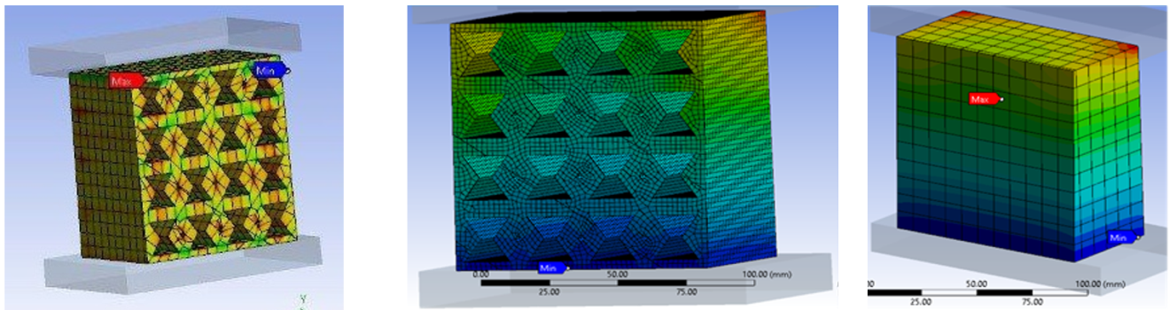 Для обеспечения точности модели применялась сетка, адаптированная к геометрии образцов (кубы 100×100×100 мм, 200×200×200 мм и 300×300×300 мм) для минимизации ошибок дискретизации и соответствует рекомендациям по моделированию ауксетических структур в ANSYS [1, 2]. Верификация модели осуществлялась путем сравнения результатов численного анализа с данными реальных испытаний на гидравлическом прессе в соответствии с ГОСТ 10180, после чего вносились корректировки в параметры материала для достижения сходимости.