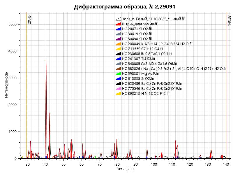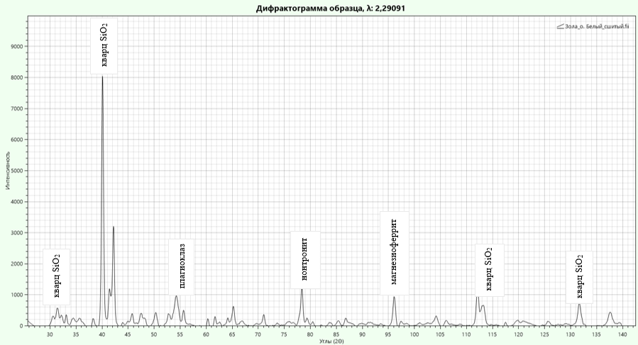 Рассмотрение образцов золы от сжигания осадка сточных вод проводился на дифрактомере рентгеновский ЭКРОС XRD-9500 (внесён в государственный реестр средств измерений РФ под № 88425-23.Р). Проведение опытов с использованием рентгеновского излучения для анализа структуры материалов осуществлялся в научно-исследовательской лаборатории комплексных физико-химических исследований Петербургского государственного университета путей сообщения. В качестве исследуемого материала использовалась зола от сжигания осадков сточных вод о. Белый, г. Санкт-Петербург. Результаты представлены на Рис. 2 в виде дефектограммы образца.