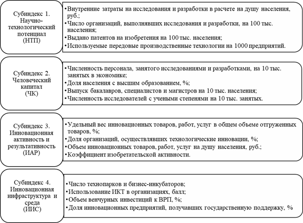 Для комплексной оценки инновационного потенциала регионов СЗФО разработана методика, базирующаяся на системе показателей, сгруппированных в четыре субиндекса (Рисунок 1).