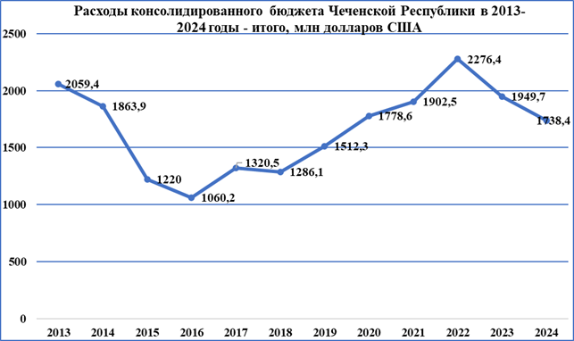 Рис. 4. Расходы консолидированного бюджета Чеченской Республики в 2013-2024 годы - итого, млн долларов США