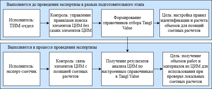 Следует отметить, что применение ТИМ при проверке количественных показателей позволяет большую часть работы выполнять на подготовительном этапе, не включенном в процесс рассмотрения сметной документации в соответствии с внутренним регламентом экспертного учреждения. Подготовительный этап автоматизированного подсчета выполняется ТИМ-отделом экспертного учреждения и включает настройку правил идентификации и формирования справочников в системе Tangl Value. Второй этап осуществляется экспертом-сметчиком уже в процессе экспертизы: он контролирует связь элементов ЦИМ со сметными позициями и получает из модели фактические объемы работ и материалов для проверки локальных сметных расчётов. Данный процесс отражен в схеме на рисунке 1.