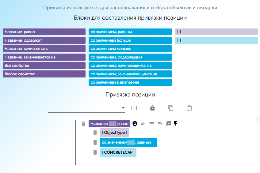 - Свойство (отображается фиолетовым блоком) — это категория или тип данных (например, «Category», «Наименование», «Класс бетона»), по которому осуществляется поиск соответствующего элемента в модели.