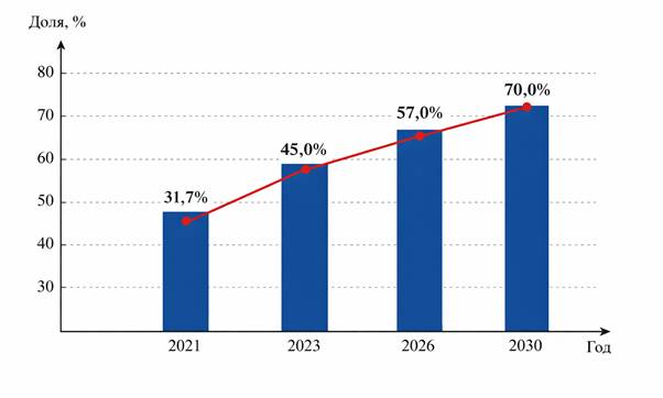 Горизонтальное, наклонно-направленное бурение с горизонтальным окончанием, s-образное бурение в сочетании с многостадийным гидроразрывом пласта сформировало технологический стандарт освоения таких залежей, однако управляемость данных операций обеспечивается лишь при использовании адаптивных календарно-сетевых решений, учитывающих геомеханическую устойчивость ствола скважины и ограничения по рискам осложнений [13]. Для корректной интерпретации отраслевой динамики в Российской Федерации целесообразно представить на рисунке 1 прогнозные значения доли ТРИЗ в суммарном балансе добычи.