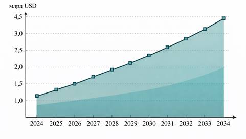 Стабильный рост интереса к подобным решениям отражается в прогнозных оценках динамики мирового и локальных рынков цифровых двойников, что косвенно указывает на их закрепление в качестве нового технологического стандарта управления сложными активами в условиях дефицита времени на принятие решений и высокой стоимости ошибок. [17] (см. рис.2).