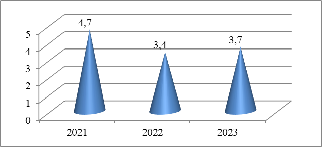 Индикативная интерпретация такова: падение доли сектора с 4,7 до 3,4 % – признак ослабления отрасли в структуре экономики региона. Частичное восстановление до 3,7 % не компенсирует прежнего значения. Значение ниже 4 % традиционно считается индикатором низкой активности в строительном секторе. На макро-уровне доля ВДС в строительстве от суммарной ВДС в экономике в 2023 году: в России 5,2 %, в США 4,2 %, в Великобритании и Японии – 5,9 %, в Китае – 7,1 % [15].
